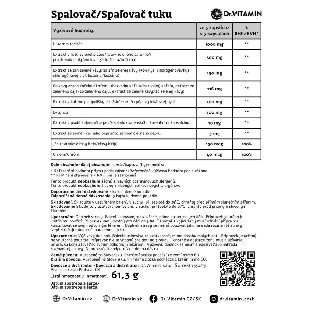 Extrakt z kajenského pepře (10 mg): Obsahuje kapsaicin, který spouští termogenezi – proces, při kterém tělo produkuje teplo. Výsledkem je zvýšený výdej kalorií i v době, kdy zrovna necvičíte.